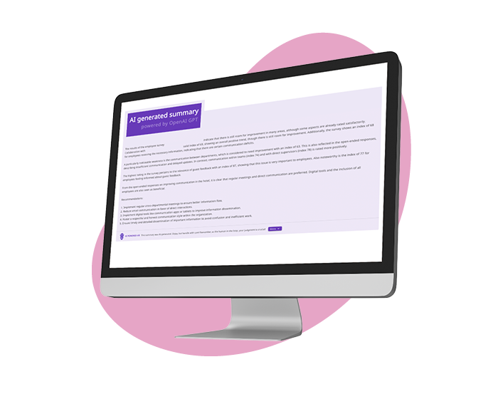 Mit AI powered HR meint man den Einsatz von künstlicher Intelligenz in bestimmten Bereichen deiner Mitarbeitendenbefragung. Konkret bei der Auswertung, Interpretation und Zusammenfassung deiner Mitarbeitendenbefragung.