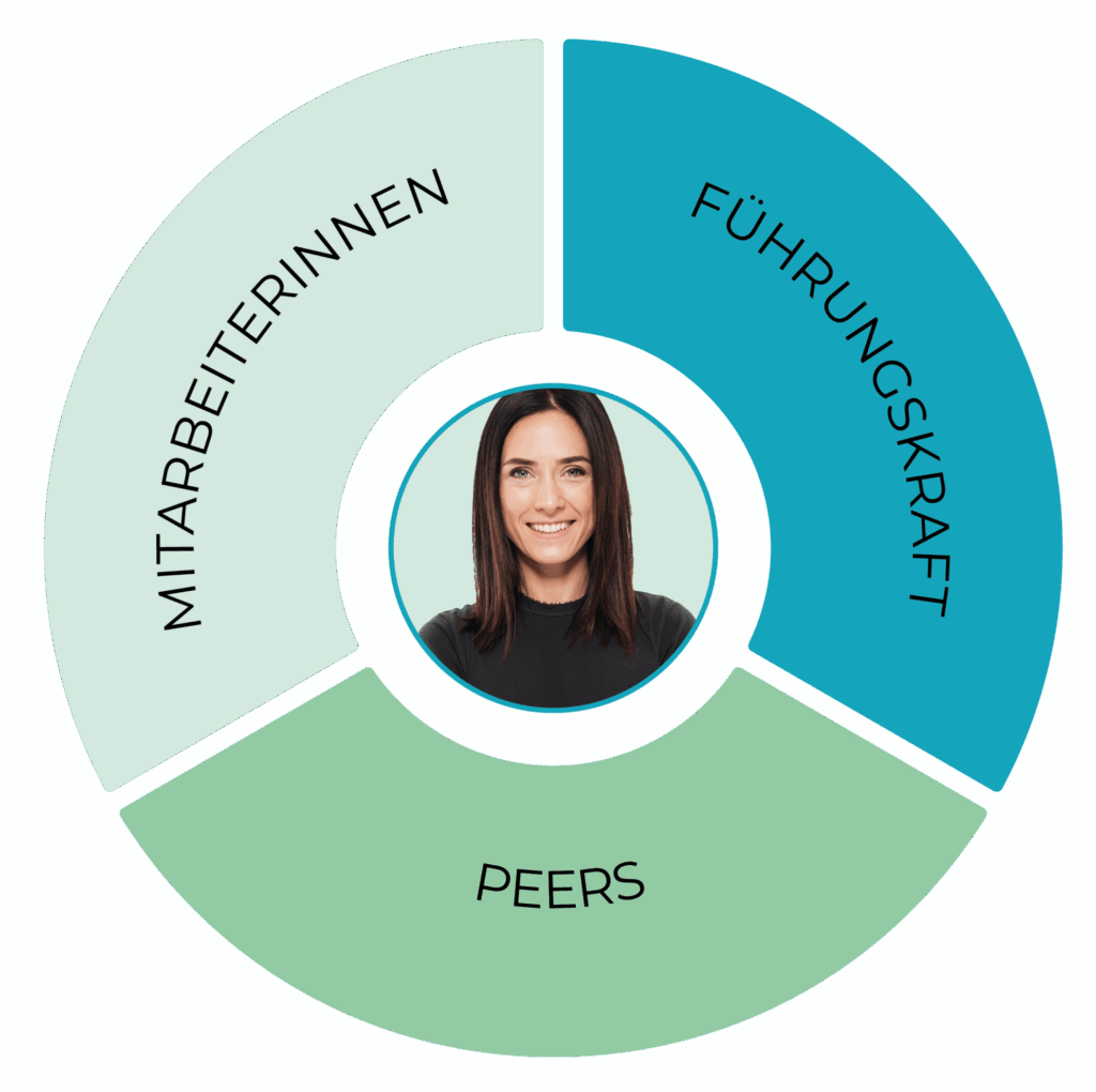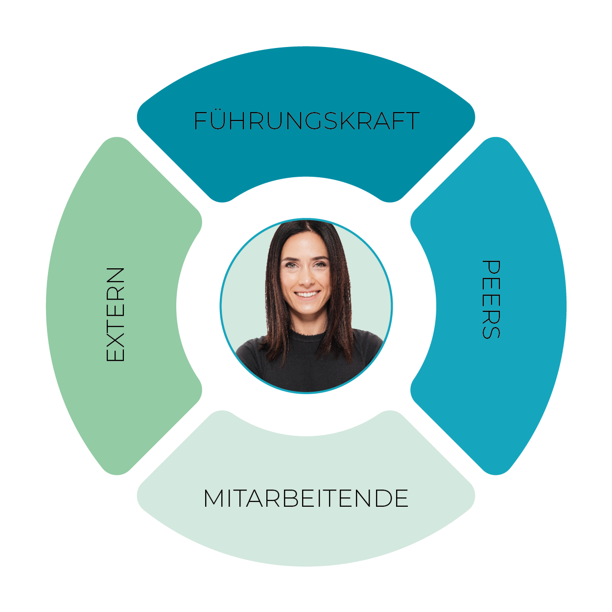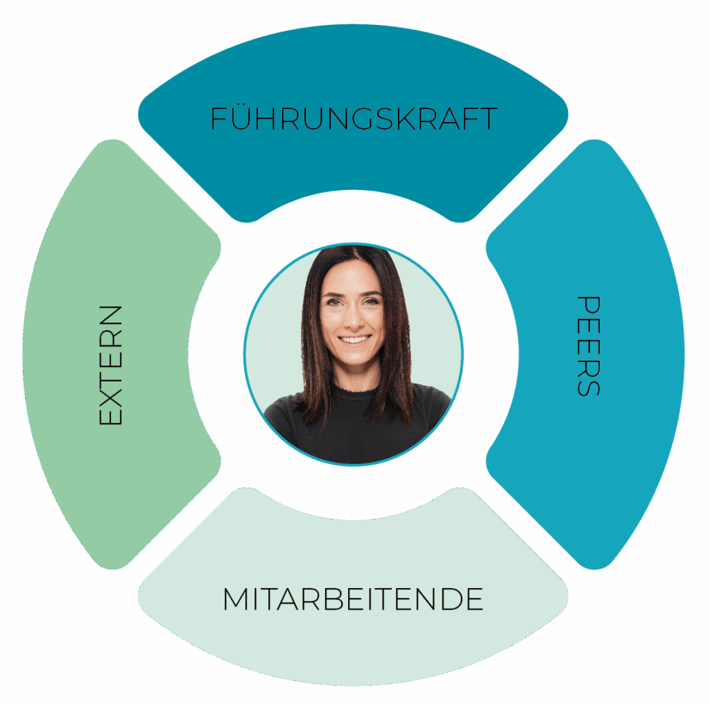 360-Grad-Feedback: Selbstsicht, Führungskraft des Feedbacknehmenden, Peers oder Kolleg:innen, Mitarbeiter:innen in der eigenen Abteilung, externe Personen z.B. Coaches