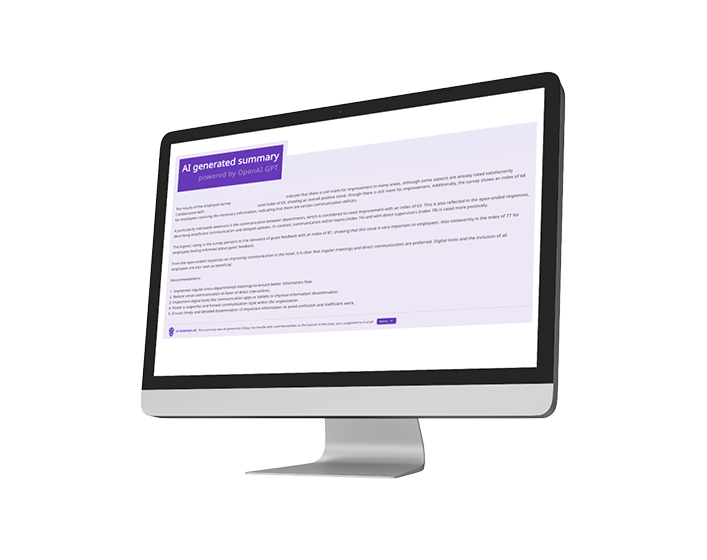 Für uns als Anbieter von Mitarbeiterbefragungen stellt die KI eine wertvolle Unterstützung dar: Freitextantworten werden automatisch analysiert und zusammengefasst, sodass du dich nicht mehr mühsam durch unstrukturierte Daten arbeiten musst. Stattdessen kannst du dich voll und ganz darauf konzentrieren, konkrete Maßnahmen zur Verbesserung der Zufriedenheit direkt umzusetzen.